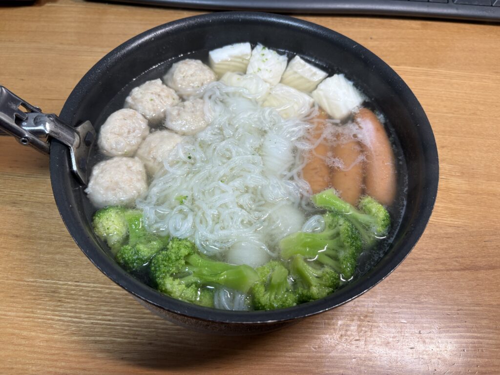 9:19 帰宅して、ちょっと遅い朝食。鍋作りました。具材は冷凍イカに冷凍肉団子、しらたき、冷凍ブロッコリー、そしてシャウエッセンです。味覇で味付け。これだけ食べてもなんだか物足りない。やはり炭水化物は偉大だ。ラーメン食いて~。