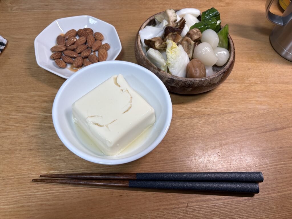 おしんこ盛り合わせにアーモンド、レンチンした湯豆腐。