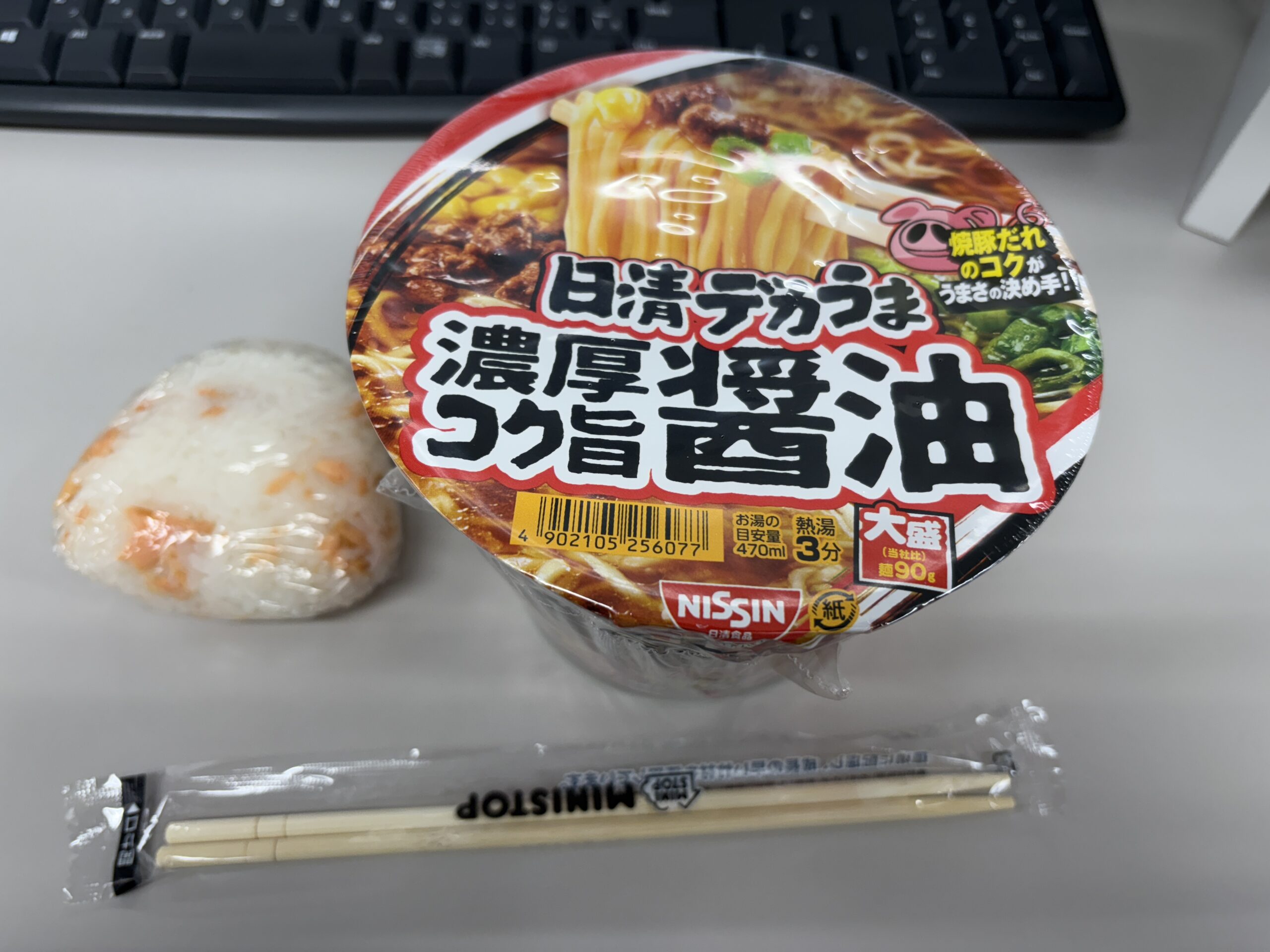 12:00 鮭おにぎりとカップラーメン。インスタントラーメン中毒から抜け出せないままです。