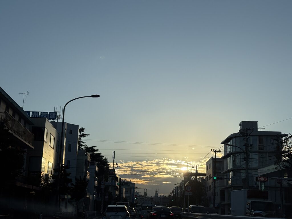 朝日がまぶしい。