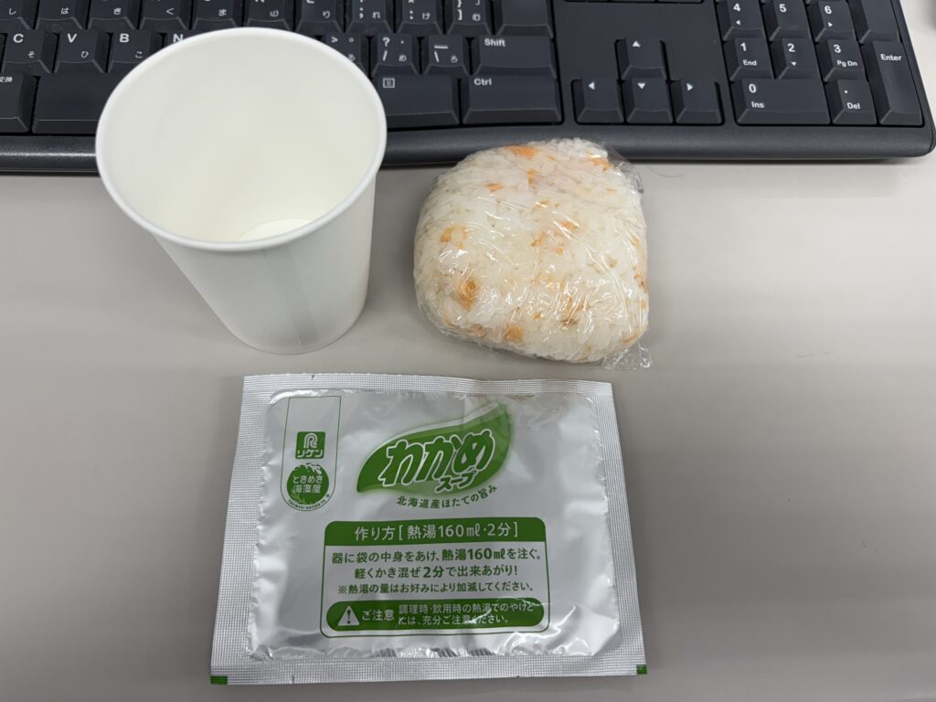 12:02 鮭おにぎりとワカメスープ。午前中は社内で提出書類の作成。15:00ごろまで社内で書類やってから、お出かけします。