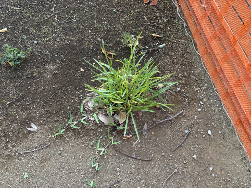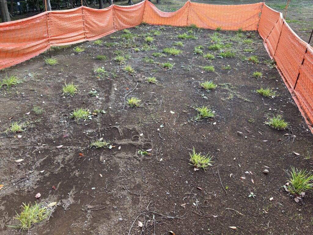 7月末、真夏のクソ暑い時期に植栽した、セントオーガスチングラスですが、枯れずに成長してました。水やりをお願いしていたのですが、毎日細目に水やりしていただいていたようです。だけどさすがに1株/㎡じゃ植える数少なかったようで、まだまだスカスカです。こりゃ設計ミスだな。