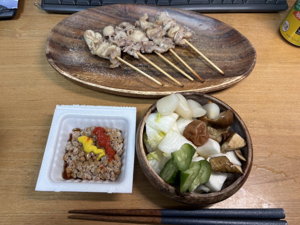おしんこ盛り合わせ、豆板醤納豆に鶏皮。