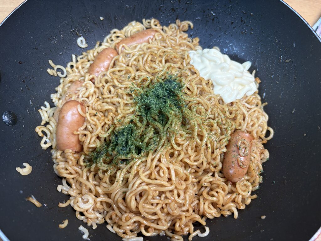 ダメだってわかってるのに、食べちゃうんだよな。日新焼きそば2袋。ご丁寧にマヨネーズ添え。