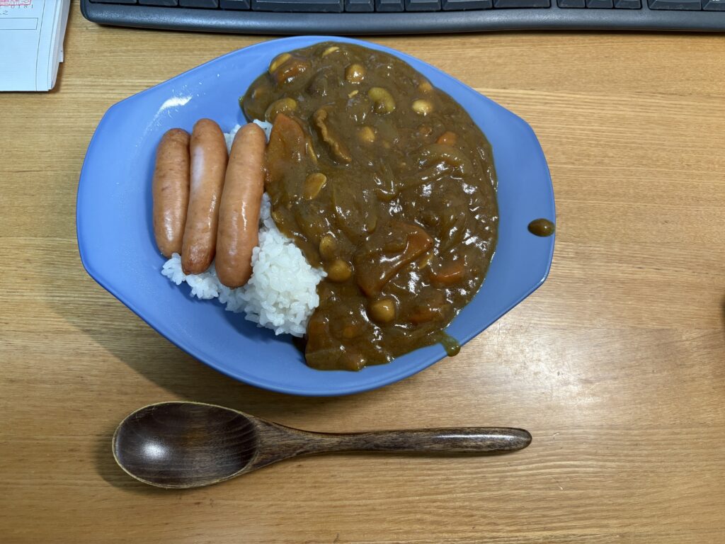 8:12 お腹空いたので、カレー(ライスそこそこ)いただきます。シャウエッセン3本をトッピング。
