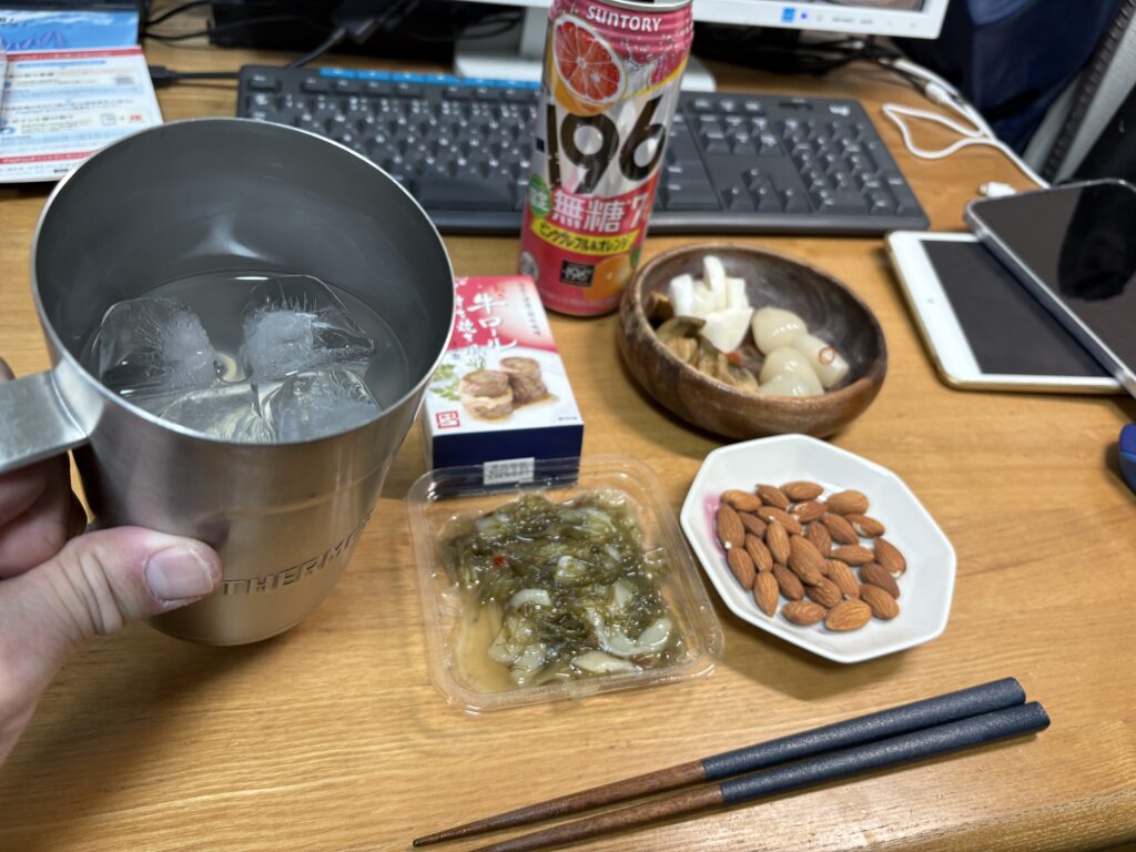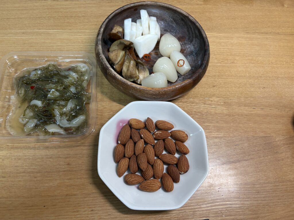 おしんこ盛り合わせ、イカわさめかぶにアーモンド。