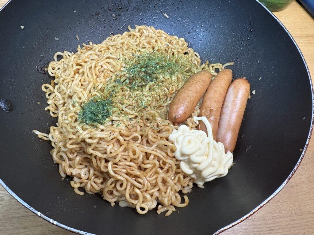 やっぱりやってしまいました。だから買わなきゃよかったんですよ。日清焼きそば2袋。シャウエッセン3本にマヨネーズ添え。